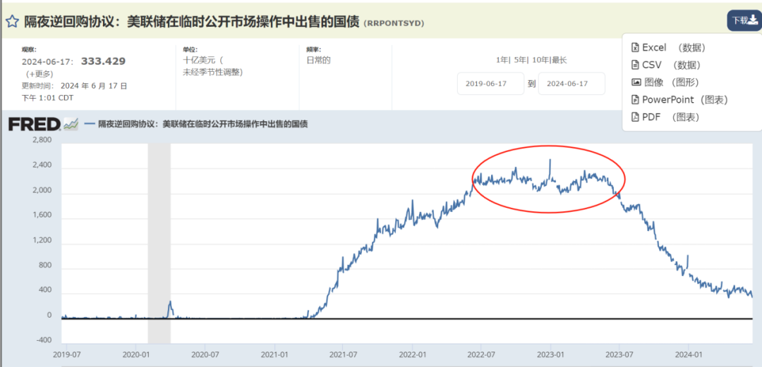 2022年12月29日,该数据见顶回落(最高时曾超过2.3万亿美元)。2023年美国中小银行破产风波期间,更是加大了操作力度,向市场释放了充分的流动性,并于当年5月正式确立下行趋势。截至6月17日的数据,规模已经下降至3334.29亿美元,近期以来,已经连续出现低于4000亿美元的数据。从趋势上也可以发现,该数据正在向2021年8月之前回归。