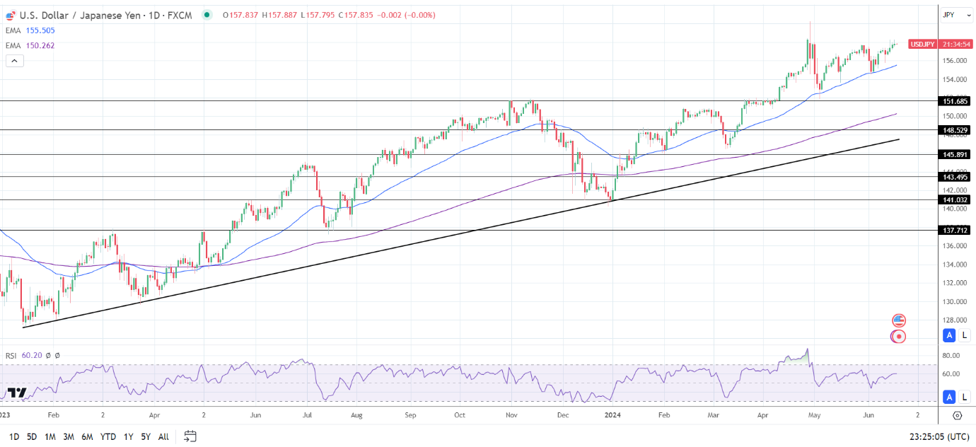 14天RSI为60.20,表明美元/日元将回升至4月29日高点160.209,然后进入超买区域。