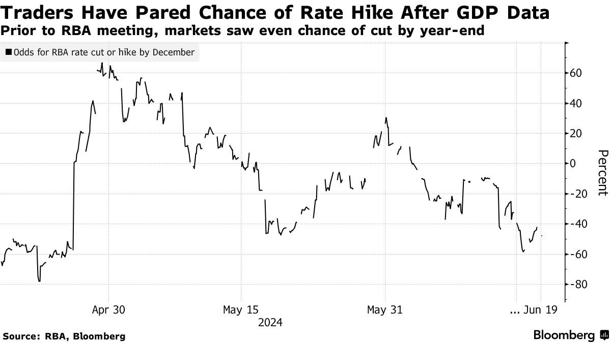 澳洲联储公布利率决议后,澳元几乎没有变动。而对政策敏感的澳大利亚三年期国债收益率小幅上升,因为交易员对澳洲联储今年将出台宽松政策进行谨慎押注。货币市场目前预计,澳洲联储到12月降息的可能性不到40%,低于利率决议公布前的50%。