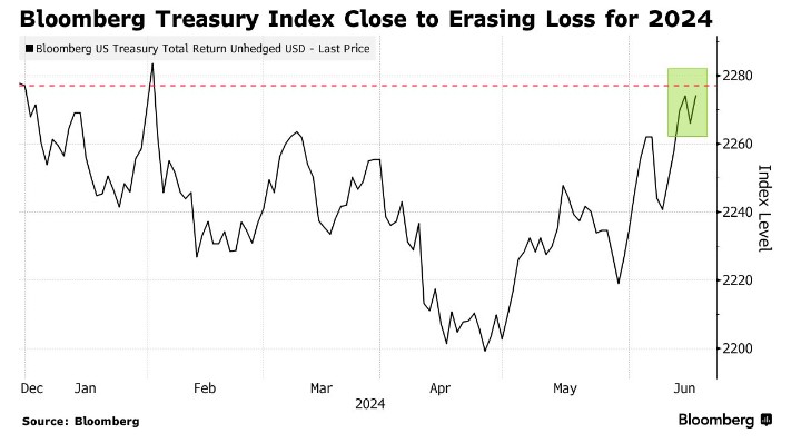 Bloomberg追踪美债回报率的指标今年以来仅下跌0.1%,而今年4月的跌幅高达3.4%。美债本轮反弹的核心是,投资者押注美国物价降温将促使美联储比官员们所暗示的更早、更大幅度地降息,从而有效限制了美国国债收益率的上涨幅度。
