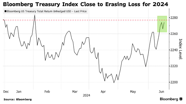 彭博社一项衡量美国国债市场总回报率的指数显示,临近上半年尾声,该指数在2024年的跌幅仅为0.1%,而在4月份,美国国债的年内跌幅还曾一度高达3.4%。