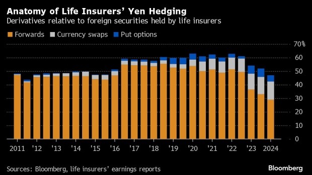 智通财经获悉,日本寿险公司将针对日元反弹的对冲保护措施缩减至10年低点,并可能在未来几个月进一步削减这些头寸。据汇编的日本九家最大的人寿保险公司截至3月31日的收益报告显示,这些公司47%的海外证券都有相应衍生品对冲措施,这有助于它们在日元走强的情况下免受损失。这是自2011年9月以来的最低水平,而2020年3月的高点为63%。