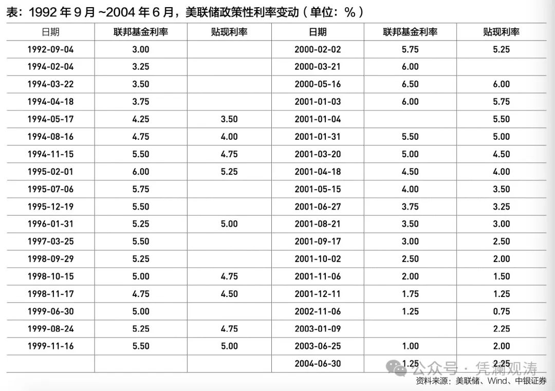 2001年1月3日起,美联储开启了新一轮降息周期。当日,美联储分别下调联邦基金利率和贴现利率50个和25个基点,并在紧急降息声明中表示:“采取这些行动的背景是销售和生产进一步减弱,消费者信心下降,金融市场某些部分条件紧张,能源价格高企削弱了家庭和企业的购买力。此外,通胀压力仍然受到控制。委员会仍然认为,根据其价格稳定和可持续经济增长的长期目标以及目前掌握的信息,风险主要集中在可能在可预见的将来造成经济疲软的条件上。”到2003年6月25日,联邦基金利率累计下调13次、550个基点至1%,贴现利率下调15次、400个基点至2%。