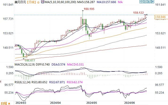 美元兑日元日线图来源:易汇通北京时间6月21日11:32 美元兑日元 报 158.929/941。
