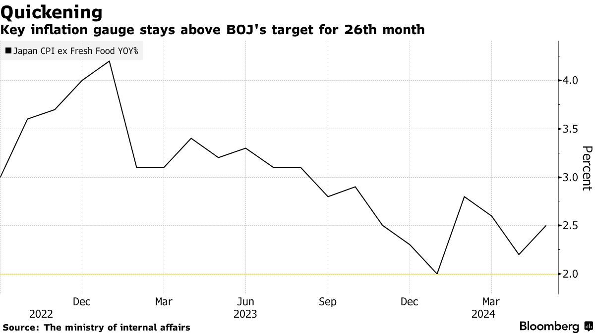 在能源成本上升的推动下,日本通胀加速,这一结果为日本央行在未来几个月考虑加息提供了支持。周五公布的数据显示,日本5月全国核心CPI同比上涨2.5%,高于4月的2.2%,略低于经济学家预期的2.6%,但连续第26个月持平于或高于日本央行2%的目标水平。其中,电力价格同比上涨14.7%,是通胀上涨的主要驱动因素。
