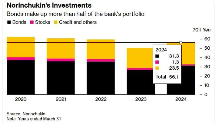 截至2024年3月底,Norinchukin持有约23万亿日元的外国债券,占其管理资产总额56万亿日元的42%。根据日本央行的数据,截至3月底,存款类金融机构持有的未偿还外国债券达到117万亿日元。Norinchukin持有的债券约占这一数字的20%。