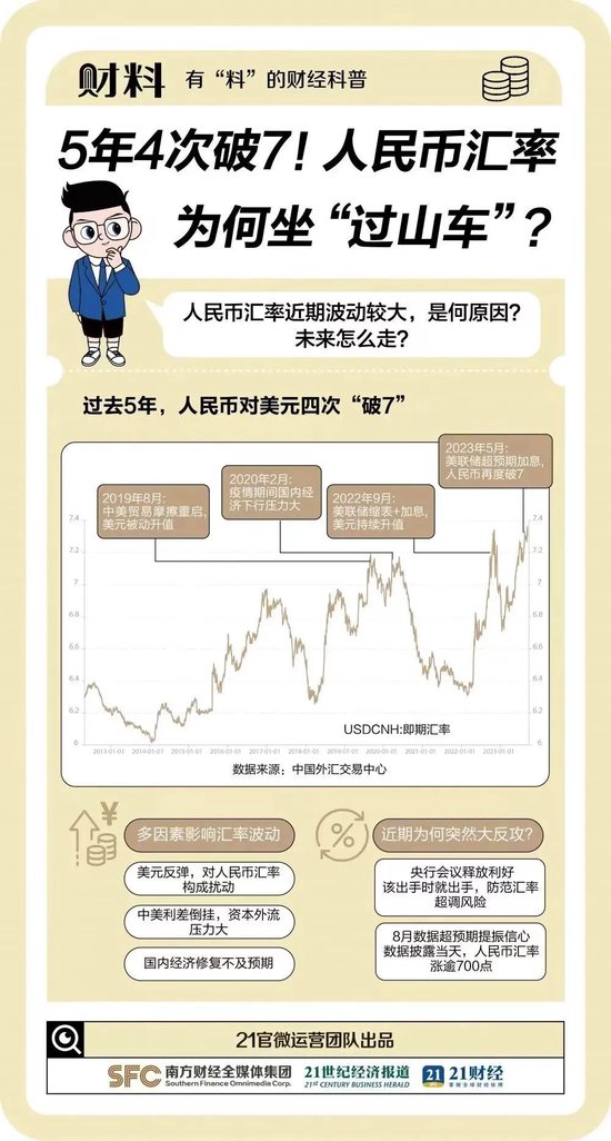 据《21财料》栏目此前统计,近五年来人民币兑美元汇率已经四次“破7”,多因素影响汇率波动