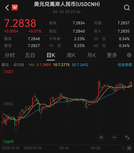 截至6月25日8时,美元兑离岸人民币报7.2826,美元兑在岸人民币收于7.2598。
