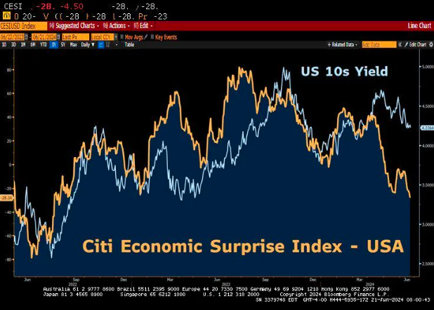 颇为值得一提的是,本月迄今,指标10年期美债收益率已累计下降了超过25个基点,债市多头近几周来的反攻浪潮不可谓不猛烈。而如下图所示,美债收益率的回落与花旗美国经济惊奇指数的下行势头是保持同步的。