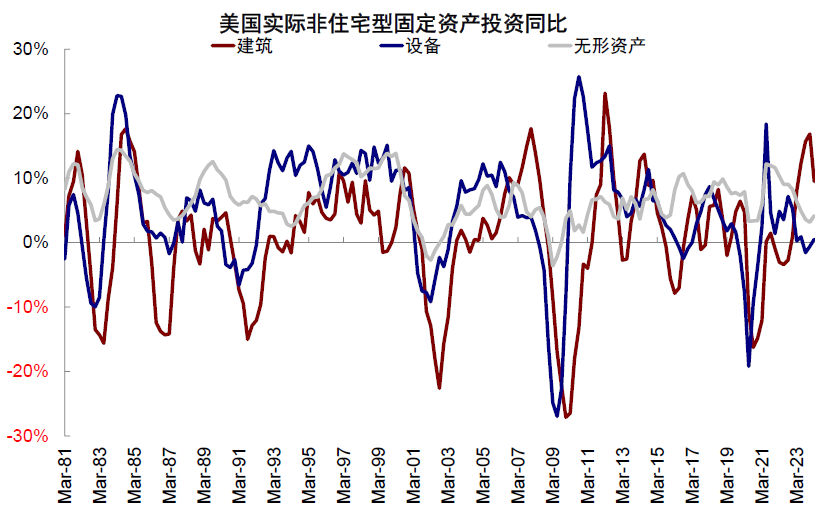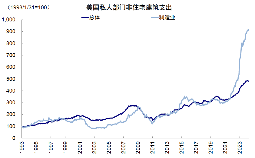 ► 投资支出:两党均有扩大基建投资和支持美国制造业的计划,尤其是拜登的投资计划。拜登在任期间颁布的三大法案显著提振了固定投资规模,制造业的建筑投资增速显著且主要以制造业相关建筑支出为主。以卡特彼勒为代表的美国工业股也在2023年的财报中提及政府基建项目对北美市场营收的支撑,不过近期建筑投资已经开始走弱,逐渐转向设备投资。尽管政策推进的程度取决于国会的组成,但基建和制造业投资作为两党共识推出的可能性较大。