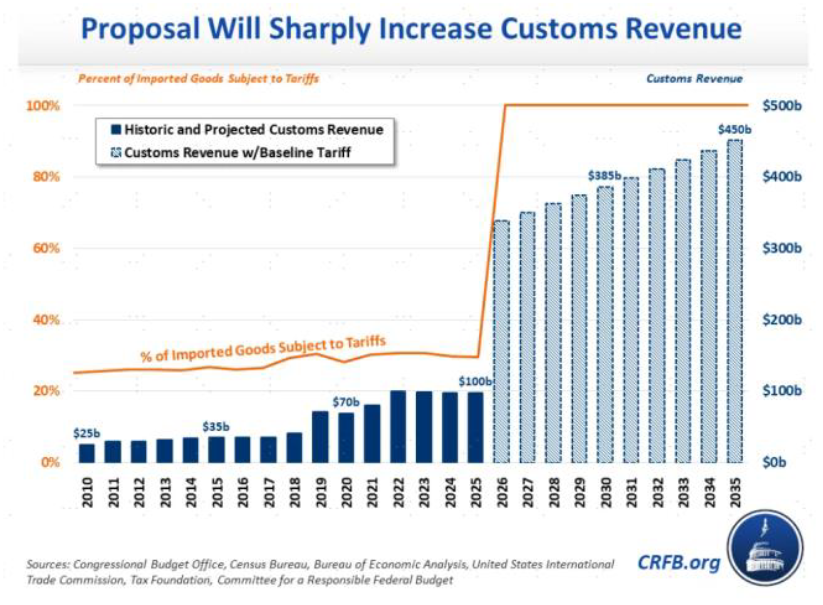 图表:CFRB预测特朗普计划的10%的基准关税将在2026至2035财年间带来约2万亿美元的收入