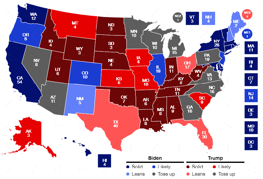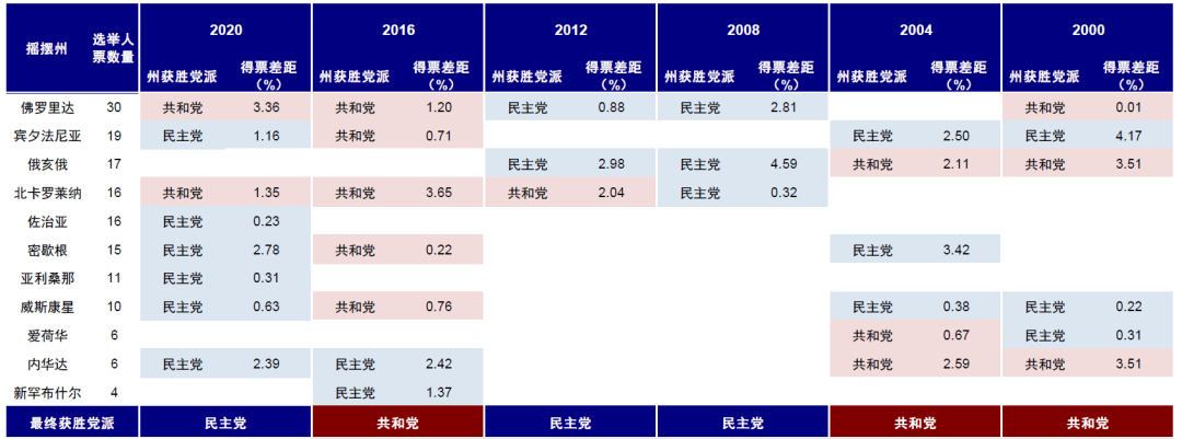如何追踪美国大选选情?尽管民意调查可以作为持续追踪选情的参照,但因为选举规则和样本偏差等原因,或导致最终结果有差异,如2016年民调与选举结果出现巨大背离,以及2020年因为邮寄选票导致的最终“翻盘”,因此观测摇摆州的支持率相比整体更为准确和重要(摇摆州指在那些历史投票上多次反转且两党竞争程度激烈的州)。摇摆州的重要性在于:1)两党均无明显优势,选民投票倾向不确定(通常两党得票差距小于5%);2)但同时有相当数量的选举人票(各州对应参众两院议员人数),在美国“赢者通吃”(赢得州内普选票的候选人将赢得该州的所有选举人票)的选举人团制度下需要格外关注摇摆州的支持率情况。