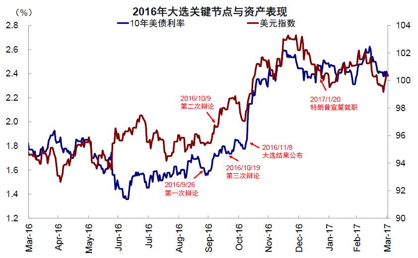 图表:2016年特朗普当选后,美元和美债利率均趋势性走高