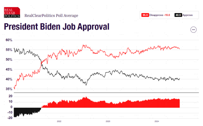 图表:公众对拜登政府工作的不满意度自2023年下半年以来持续抬升至当前的55.5%
