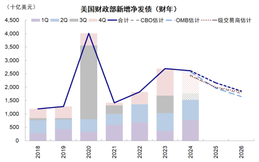 图表:债务上限的临近或再度导致发债不均,2025年美债供给量可能前低后高