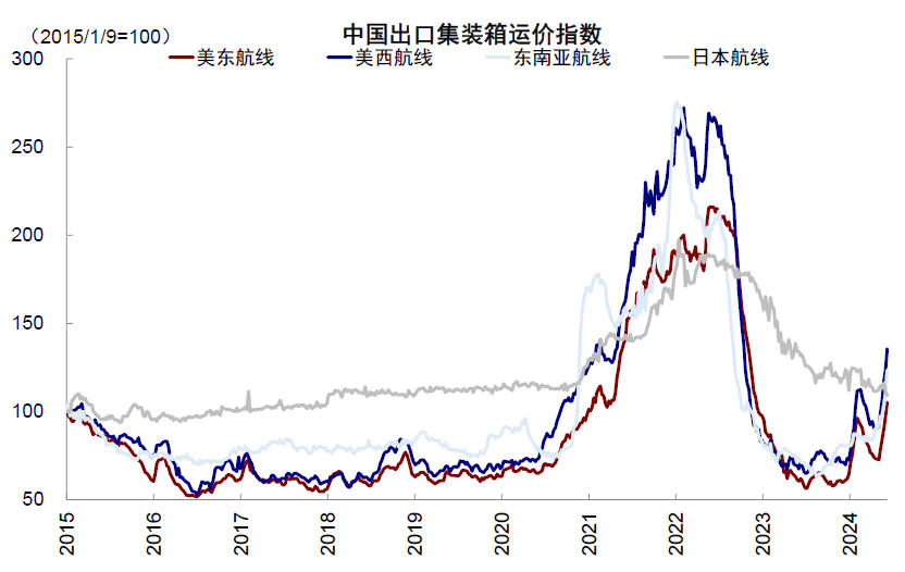 ► 贸易政策:拜登和特朗普均推行高关税政策,或加剧全球供应链压力,进而推升美国进口原材料成本和商品价格。拜登已于5月宣布加征对中国进口商品的关税,包括将新能源车从25%加征到100%,半导体和太阳能电池从25%增加至50%,钢铁、非新能源车锂电池加征至25%等。拜登的加征范围仅包含180亿美元的商品且部分加征在2026年才执行。相比之下,特朗普政策的激进程度更高。特朗普表示将对进入美国的商品征收10%的基准关税[2],同时对中国征收60%或更高的额外关税,针对某些地区或行业还会征收“特定税”,如对产自墨西哥的中国汽车加征100%关税等。根据无党派机构CFRB预测,10%的基准关税将在2026至2035财年间带来约2万亿美元的收入[3],60%对中国商品的额外关税或导致税收不增反降[4]。贸易壁垒对于全球贸易环境、以及美国自身通胀都将带来一定影响。此外,为了规避潜在影响,提前补库可能推动了部分进口需求前置和近期运价上涨,美国实际库存增速有所修复,但需要关注需求抢跑后、叠加大选不确定性,在后半年带来对运价和出口的反向压力。