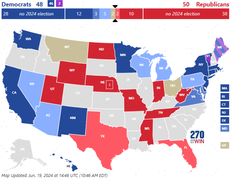 图表:目前参议院中共和党控制50席,民主党控制48席