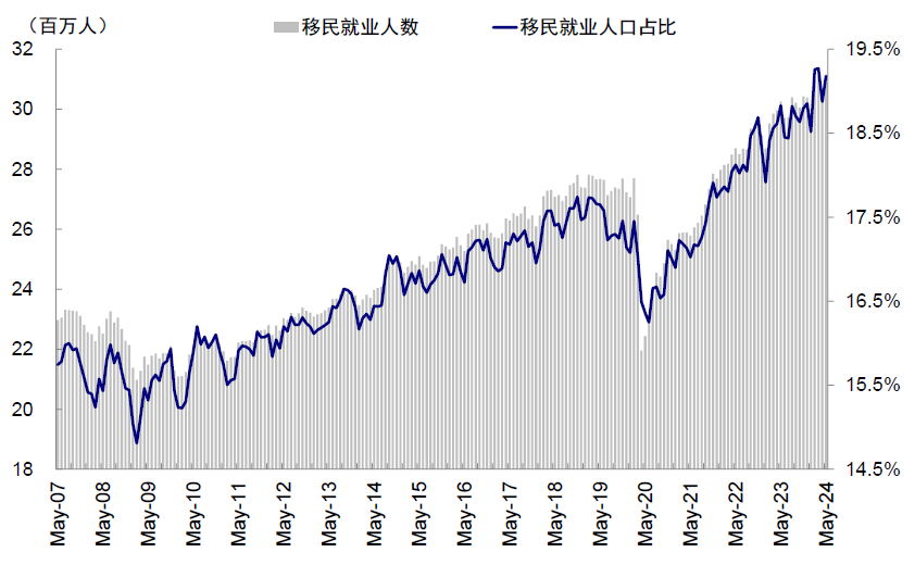 图表:近期移民就业人数的增加缓解了美国的“劳工荒”