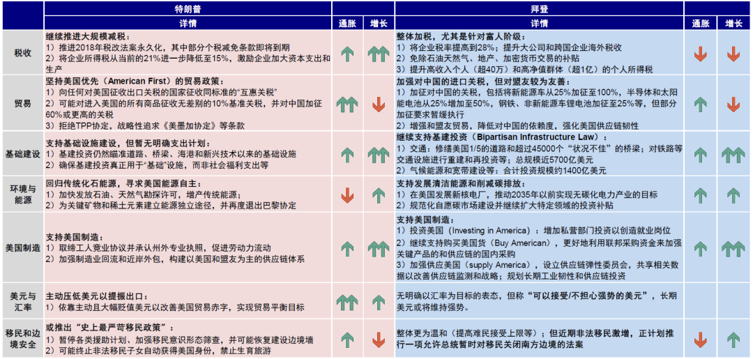 ► 产业政策:民主党更青睐于高端制造回流,拜登执政期间普遍采取政府补贴等措施支持相关产业发展。拜登表示将继续推行在任期间颁布的基建、芯片和削减通胀法案,或加大清洁能源等领域的补贴,这一举措同样对价格施加上行压力。但共和党的“美国制造”重点更多放在传统能源和低端制造业上,特朗普主张减少高新技术产业方面的补贴和支出,回归传统化石能源,同时或将取消新能源车和电池的绿色补贴。
