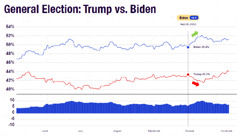 图表:2020年首场辩论特朗普的表现导致辩论后支持率下降