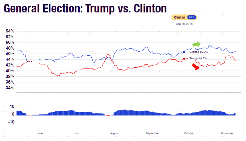 图表:2016年首场辩论后希拉里凭借稳定的发挥推动支持率稳步上升,特朗普民调支持率却明显下滑