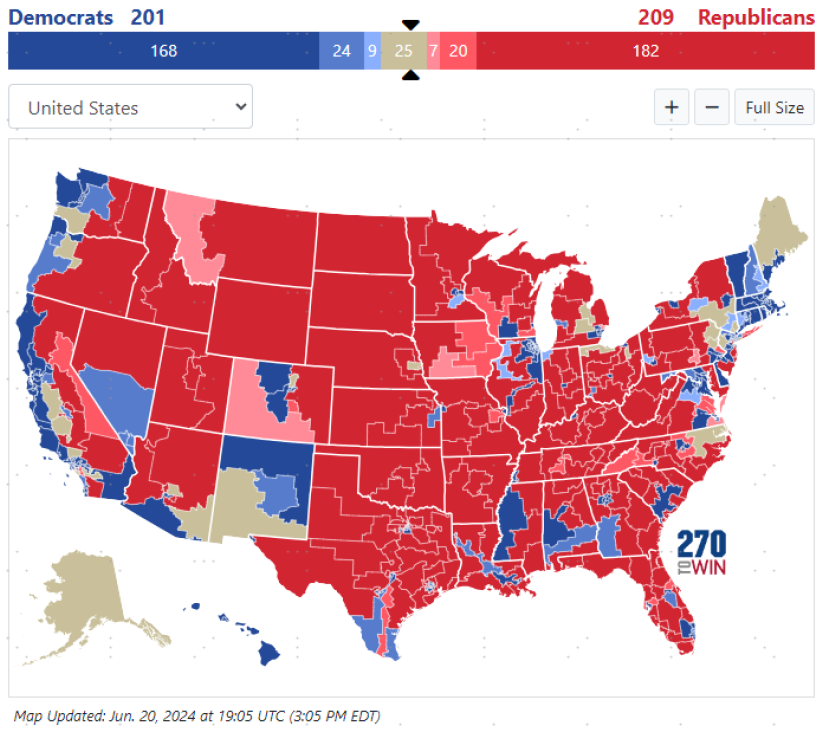 图表:众议院中共和党当前控制209个席位,略微领先于民主党的201席