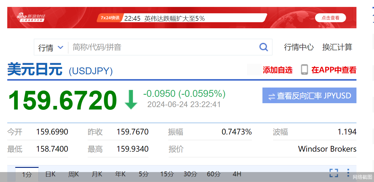 近期,日元兑美元汇率持续走弱,接近34年来最低水平。6月24日晚,日元兑美元汇率微回升至159.52。市场普遍认为,160是日本政府出手干预的一道重要心理防线。日本财务省副大臣神田真人表示,日本政府24小时都在准备着干预汇率。