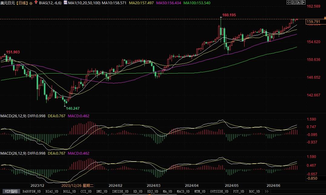 美元兑日元日线图北京时间6月26日11:46,美元兑日元报159.79/80