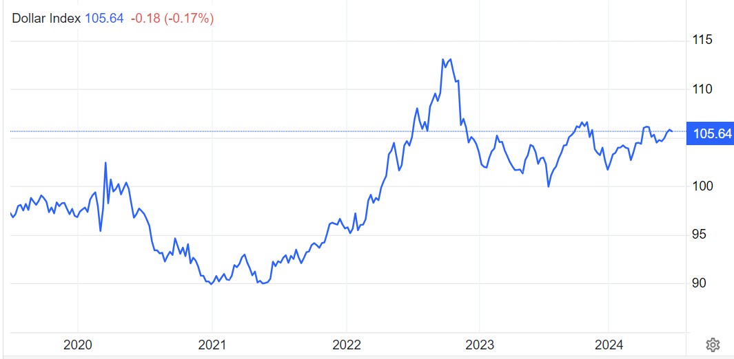 随着最新利率点阵图显示美联储将长期维持高利率,以及欧洲与美国选举周期到来,加之全球经济增长数据普遍低迷,在全球市场避险情绪的影响下美元步入强势期。