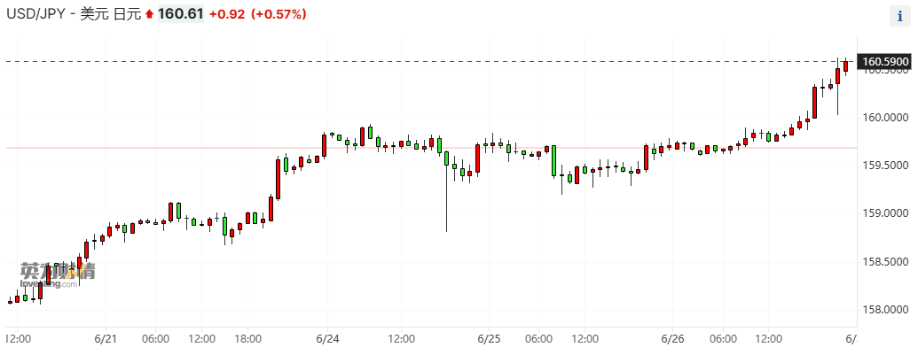 周三(6月26日)美股早盘,日元汇率进一步走弱。美元兑日元一度走高至160.62,刷新1986年以来的最高水平,日内涨幅超过0.5%或90点。