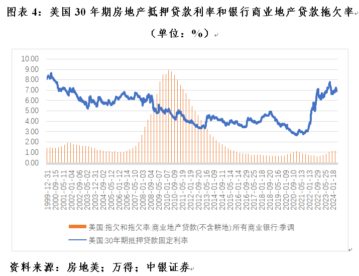 新冠疫情之后,许多上班族选择居家办公,导致商业地产空置率上升。根据穆迪最近的一份报告,2024年第一季度,全美办公楼空置率达到创纪录的19.8%,而疫情前平均约为17%,预计到2026年将进一步升至24%。通常情况下,债务展期是常规操作,但目前30年房地产抵押贷款利率为7%左右,加息前仅略高于3%(见图表4)。利率高企加上商业地产租赁市场低迷,业主只得债务违约,银行也被迫承受商业地产贷款损失增加。