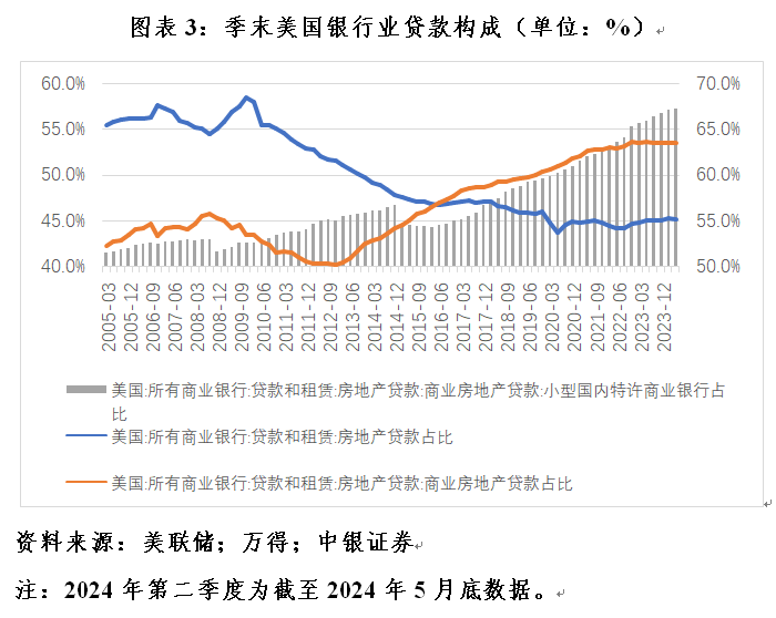 2007年次贷危机以来,美国银行业对房地产贷款的总体风险暴露降低,但对商业地产贷款的暴露增加,美国小型国内特许银行在这方面表现尤为突出。据美联储统计,到2024年5月底,美国所有银行的贷款和租赁资产中,房地产贷款占比45.1%,较2007年底回落10.5个百分点;房地产贷款中,商业地产贷款占比53.6%,上升9.5个百分点。同期,美国所有银行商业地产贷款中,小型国内特许银行占比67.2%,上升14.3个百分点(见图表3)。