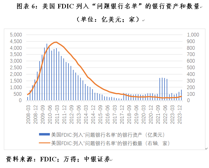据FDIC统计,2024年第一季度列入“问题银行名单”的有63家、总资产821亿美元。这些问题银行都是小银行,比2023年第四季度增加了11家、158亿美元。不过,FDIC同时表示,这个问题尚不足虑,因为“问题银行”的数量仅占银行总数的1.4%,处于非危机时期占比1%~2%的正常范围(见图表6)。另外,前述美国所有银行商业地产贷款的拖欠率虽然持续攀升,但也仍处于非危机时期占比1%~2%的正常范围(见图表4)。从这个意义上讲,美联储还可以心怀侥幸地继续等待时机,这也就意味着高利率对美国经济和金融的影响会持续更长时间。但鉴于政策传导的滞后性,等到经济突然下滑时再降息恐为时已晚。