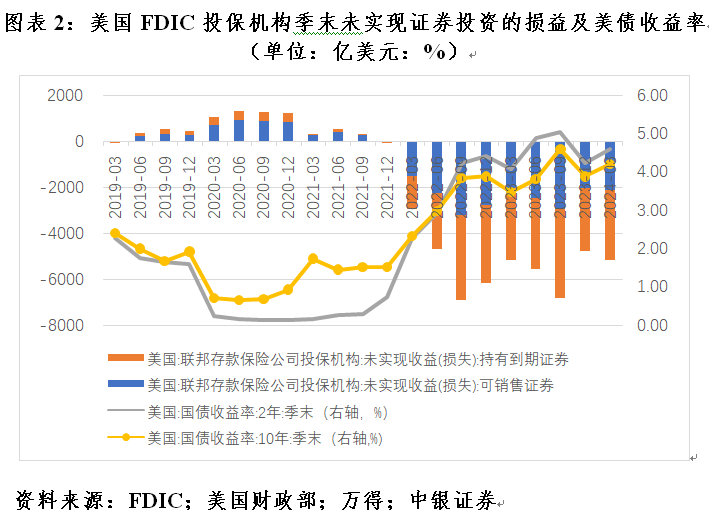 这次美联储首次降息时点一再延后,对美国金融体系自身的压力也不小。据美国联邦存款保险公司(FDIC)统计,截至2024年第一季度末,美国所有银行未实现的证券投资损失5165亿美元,为连续九个季度巨额浮亏。当季新增浮亏389亿美元,上季浮亏减少2063亿美元。这主要反映了经济和通胀韧性超预期,美联储紧缩预期重估,美债收益率上行的影响。同期,2年期和10年期美债收益率分别上升36和32个基点,上季为分别下降80和71个基点(见图表2)。