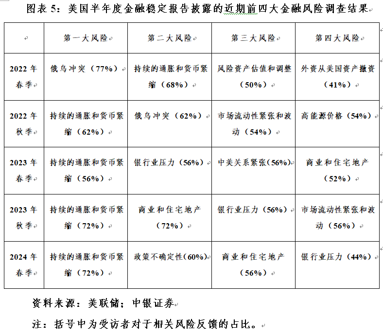 5月初,美联储发布了2024年春季金融稳定报告。报告指出,根据对25个联系人的调查结果,通胀上升和货币政策收紧的影响仍然是最受关注的风险。该风险于2022年春季报告排名近期前四大金融风险次席,但自2022年秋季报告起持续名列榜首(见图表5)。受访者指出,通胀再度加速可能会使利率保持在比先前预期更长的时间。同时,几位联系人暗示美联储可能在降息方面落后于曲线,或者在经济突然下滑的情况下可能行动不够迅速。