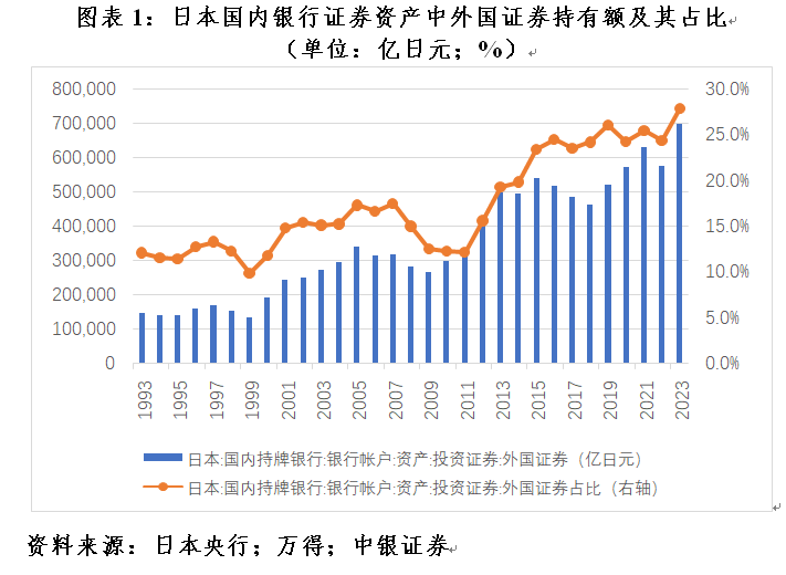 1999年以来,为应对资产泡沫破灭后的通货紧缩、经济停滞,日本央行实施了一系列非常规货币政策措施。这倒逼日本金融机构大举增加海外资产运用,寻找更高回报的投资机会。据日本央行统计,到2023年底,日本国内银行持有的证券资产中,外国证券占比27.8%,较1994~1999年均值上升15.5个百分点(见图表1)。相信,如农林中央金库这样海外投资“失手”的情况,在日本机构投资者中应该不是个案。