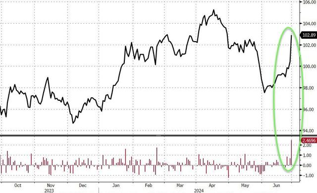 财经金融博客Zerohedge点评称,市场开始积极消化共和党/特朗普在11月获胜的可能性。巴克莱策略师们在最新报告中表示,随着美国前总统特朗普在11月5日大选中取代现总统拜登的可能性似乎增强。