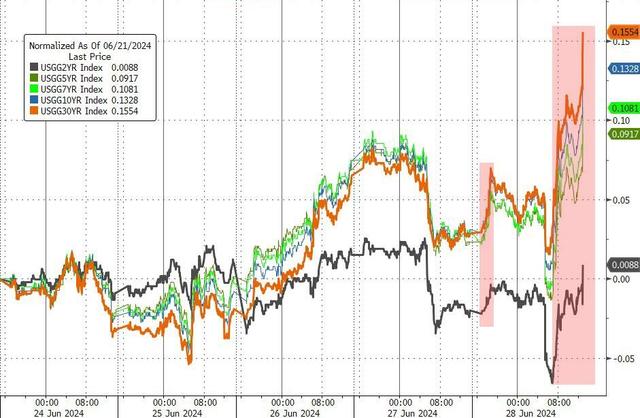 周五,虽然美国5月的核心PCE物价指数显示通胀降温,但美国国债收益率在开盘后逆转了通胀数据刚公布后的下跌,长期美债收益率收盘时飙升。美国10年期基准国债收益率上涨9.59个基点,报4.3823%,20年期美债收益率涨12.89个基点,30年期美债收益率涨13.45个基点。短期美债收益率涨势温和,两年期美债收益率涨2.07个基点,刷新日高至4.7327%。