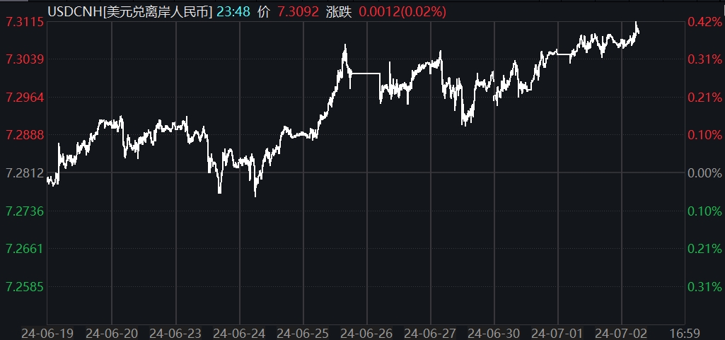 7月3日早盘,离岸人民币对美元跌破7.31关口,盘中最低报7.3115;在岸人民币对美元报7.2734元,盘中最低报7.2736元,均创去年11月中旬以来新低。数据显示,今年以来,离岸、在岸人民币对美元累计下跌2.6%、2.56%。