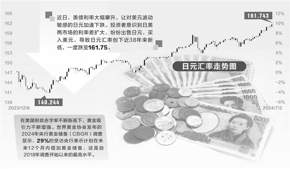 近日,美债利率大幅攀升,让对美元波动敏感的日元加速下跌。投资者意识到日美两市场的利率差扩大,纷纷出售日元,买入美元,导致日元汇率创下近38年来的新低,一度跌至161.75。