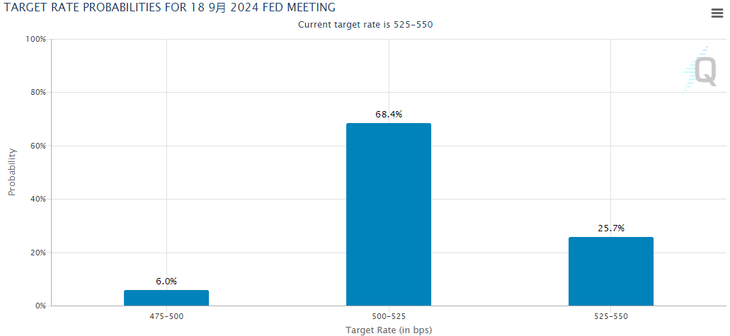 根据芝商所的美联储观察工具显示,目前利率市场交易员预计9月降息的可能性,已从周二晚些时候的69%提高到了74%。