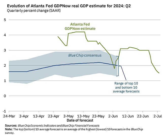 贸易逆差扩大料将连续第二个季度拖累国内生产总值(GDP)增长。亚特兰大联邦储备银行GDPNow最新预测显示,美国第二季度实际GDP增长率将仅为1.5%,较上月底的预估几乎腰斩。