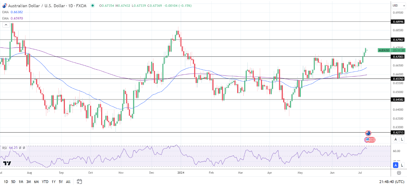 14周期每日RSI读数为64.25,澳元可能升至 0.67967 美元的阻力位,然后进入超买区域。