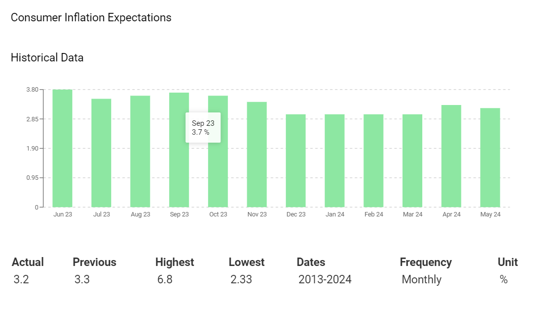 消费者支出的下降趋势和通胀压力的减弱,可能使美联储削减利率。从长远来看,消费者通胀预期在2022年6月飙升至6.8%,然后在2023年12月降至3.0%。在4月份上涨之后,跌破3%可能会增加投资者对7月11日美国CPI报告走软的希望。