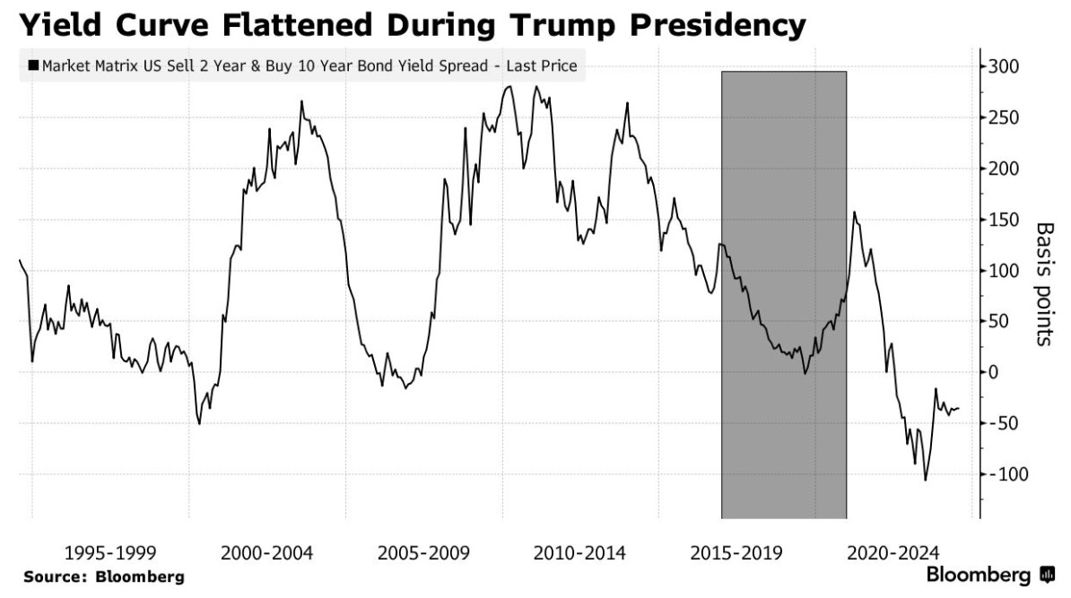 策略师Bill Zu指出,特朗普在任期间发起与中国的贸易战时,收益率下降,曲线趋于平缓,因为关税对生产率和增长造成了压力。