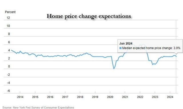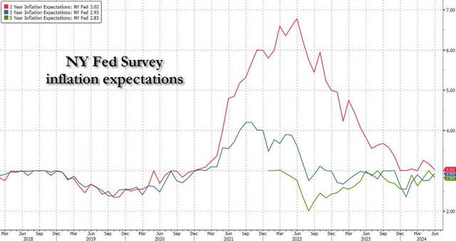 纽约联储的调查还显示,消费者对未来一年房价上涨幅度的预期从5月份的3.3%降至6月份的3%,回到了12个月的平均值水平。