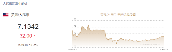 7月10日,人民币中间价报7.1342,下调32点,上一交易日中间价报7.1310。