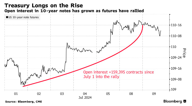 10年期美国国债收益率在7月以来已累计下跌了逾20个基点,表明交易员正在建立新的多头头寸。两年期和五年期国债期货也出现了类似的趋势。