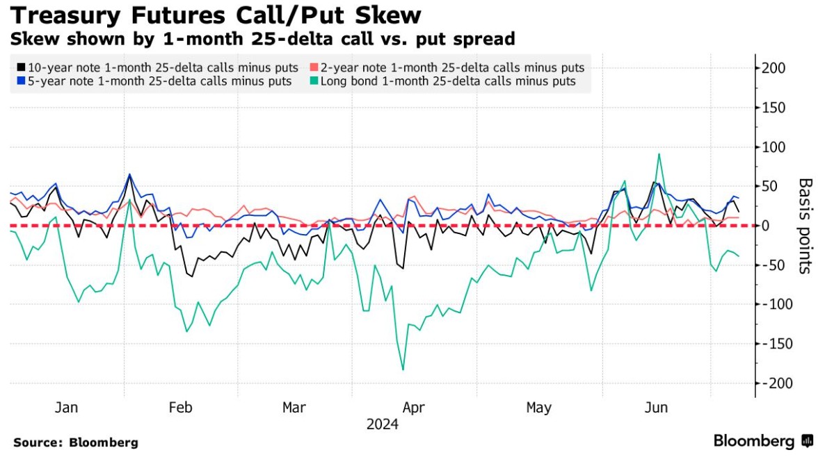 为对冲长债风险而支付的溢价仍偏向于看跌期权而非看涨期权,因交易商通过债券期权支付更高的价格来对冲抛售,而非涨势。曲线前部和腹部的倾斜继续略微有利于看涨期权,表明交易商正在支付溢价,以对冲这些期限的反弹。近期的美国国债流动包括一个看跌的10年期对冲基金,目标是在7月26日之前10年期美债收益率将升至4.4%,以及通过10年期周期权进行的近期长期波动性交易。