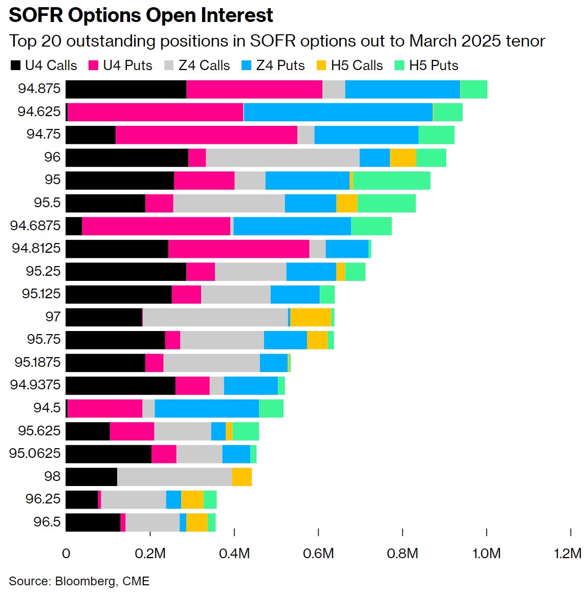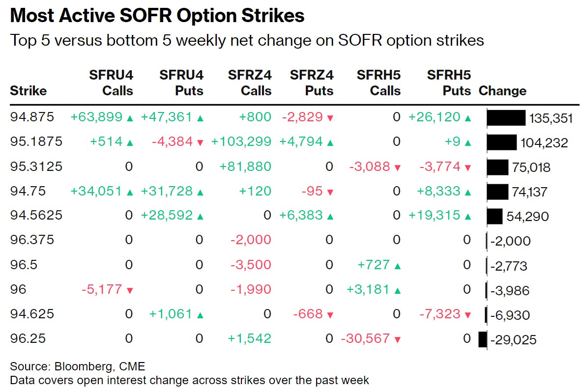 在 2025 年 3 月到期的 SOFR 期权中,由于通过 9 月 24 日的看涨期权和看跌期权增加了大量头寸,94.875 执行价现在拥有最多的未平仓合约。最近的流动包括购买 SFRU4 94.75/94.875/95.00 看涨期权。94.625 执行价也保持活跃,最近的流动包括 SFRU4 94.6875/94.625 1x2 看跌价差和 SFRU4 94.875/94.75/94.625 看跌期权,以及最近活跃的SFRU4 94.6875/94.625 1x2 看跌价差。